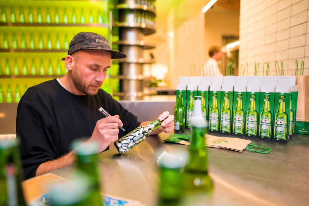 Heineken Voor de feestelijke heropening van de Heineken Experience vroeg Street Art Today Projekt C, Diana Kusuma, Team Blazin en Adam Oostenbrink live standaard Heineken-flesjes personaliseren voor de bezoekers. Onderste twee foto’s door Twycer. Share 0