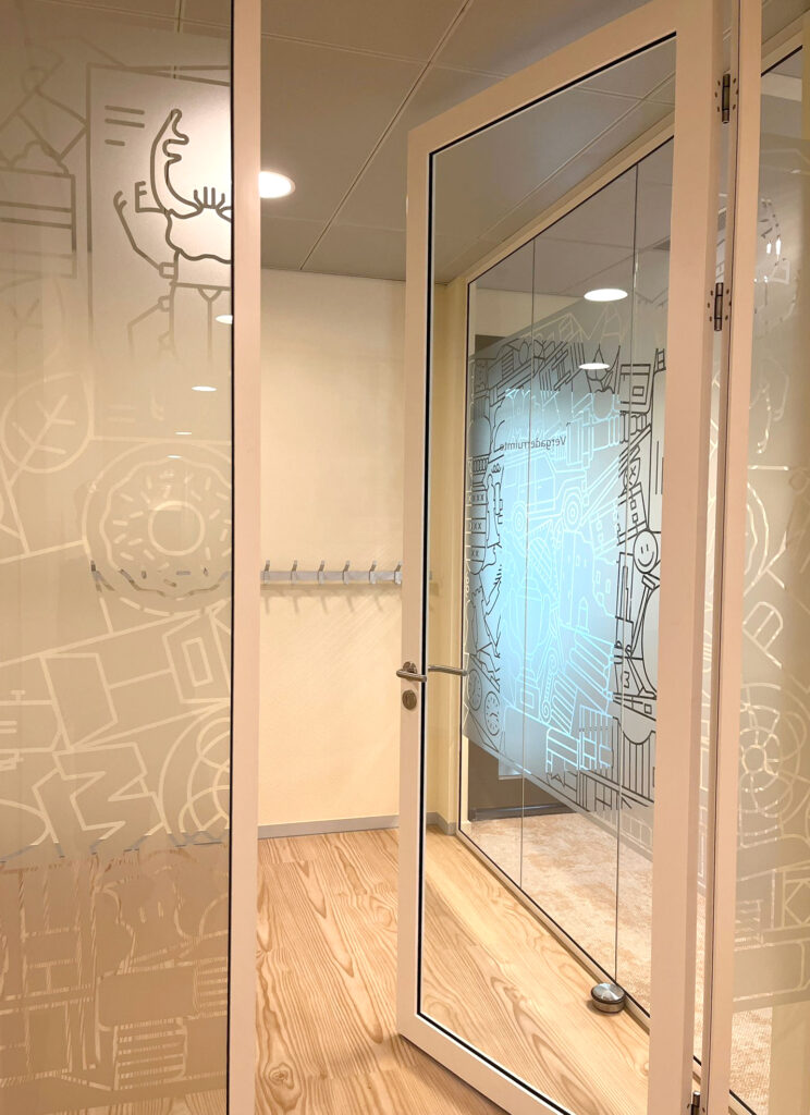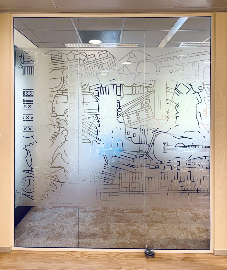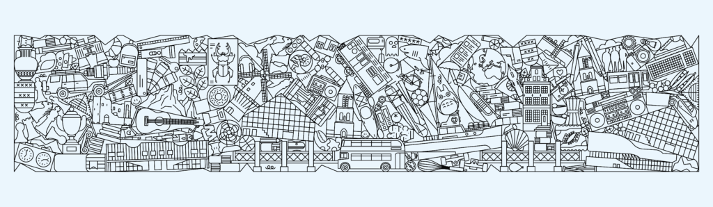 Raamsticker lijnillustratie voor de nieuwe ruimtes in bibliotheek de Boekenberg in Spijkenisse. Thema is de inhoud van boeken in de breedste zin van het woord, alles waar je voor in de bieb terecht kunt, Spijkenisse als stad en een speciale verwijzing naar de schaakclub die in een van de ruimtes zit.